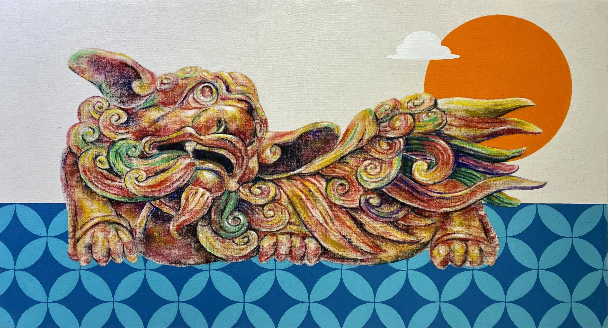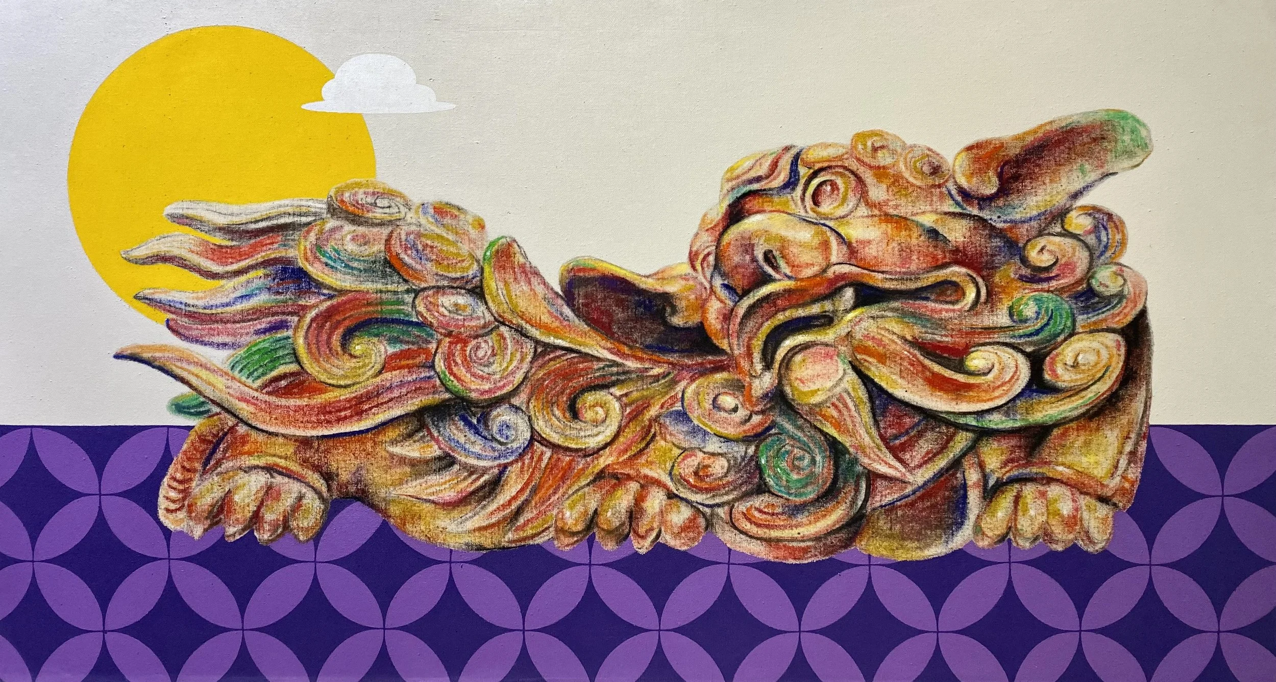 静守云天 #1 and 静守云天 #2 are both part of Liu Xuan Qi’s “Wandering Cloud” series, which captures the tension and harmony between heritage and modernity. The southern lion, a familiar figure in Singapore’s cultural landscape, gazes skyward upon a drifting cloud—a quiet yet symbolic exchange between rooted tradition and inevitable transformation. The repeating geometric circular pattern beneath the lion is known as the “Flower of Life” motif and is a common decorative element in Peranakan ceramic tiles. The pattern anchors the piece in local tradition while adding a distinctly Nanyang aesthetic that symbolises Singapore’s rich multicultural society. Liu’s integration of these elements reflects his ongoing reflection of where heritage stand in an ever-changing society.