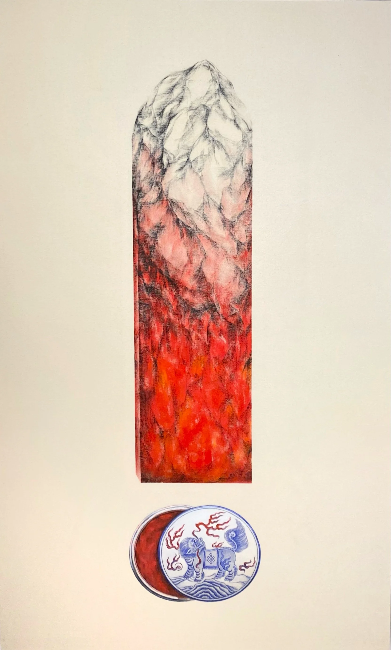 In this work, the artist constructs a symbolically charged exclamation mark using traditional East Asian scholar’s tools. The cinnabar ink paste and seal form a vivid red counterpart, symbolizing sincerity, tradition, and the warm, enduring strength of cultural continuity. When inverted, the exclamation mark transforms into a lowercase “i”—a potent symbol of identity. It is an inward reflection; from “Who am I becoming?” to the deeper inquiry, “Who am I, truly?”